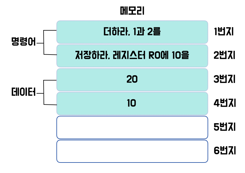 | 명령어 | 데이터를 활용하는 정보. 수행할 동작 + 대상 | 더하라 1과 2를, 출력하라 "hello world"를 |
