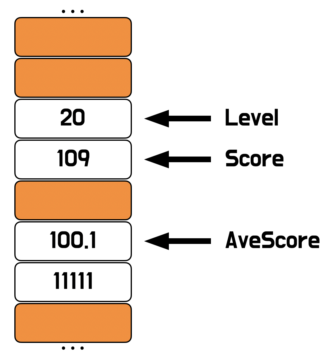 Level,Score는 메모리 한 칸(box)을 사용한다.AveScore처럼 소수점이 있는 부동소수점(float) 값은 더 큰 정밀도가 필요하므로 두 칸을 차지한다.